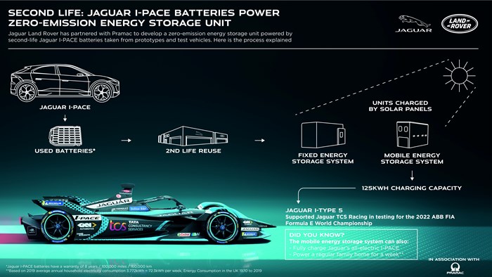 Jaguar’s engineering team have worked with Pramac to develop a zero-emission energy storage unit powered by second-life Jaguar I-PACE batteries, taken from prototype and engineering test vehicles.