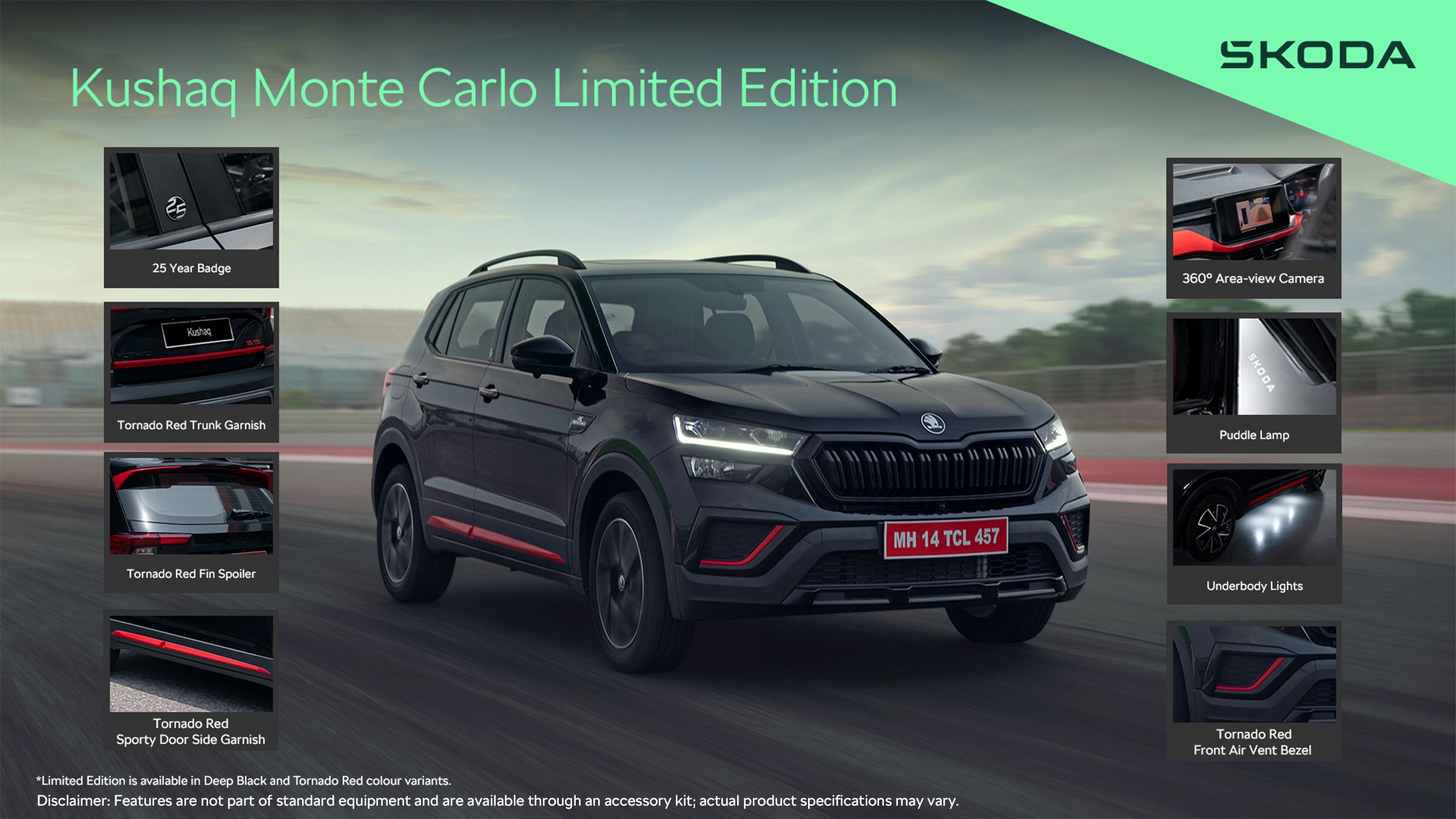 Just like the Kushaq, the Slavia Monte Carlo Limited Edition also offers the same robust powertrain and feature-rich experience, with the added flair of special styling for customers aspiring for a Škoda. Available in Deep Black and Tornado Red exterior colours, the additions include a front bumper spoiler, trunk and lower door garnishes in contrasting colour, and a complimentary accessories kit comprising a 360-degree camera setup, puddle lamps, underbody lights and 25th Anniversary badging on the B-pillar.