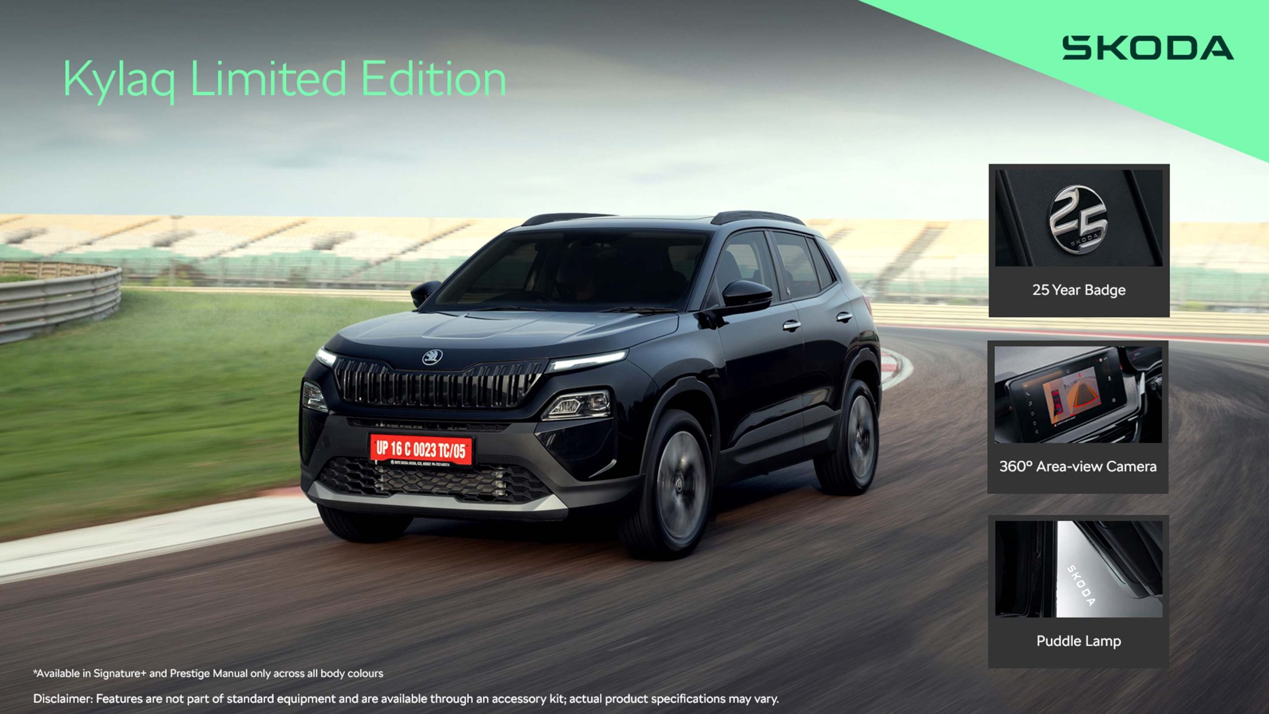 The Kylaq, Škoda’s newest SUV offering, joins the celebrations with a limited edition on the Signature+ (MT) and Prestige (MT) variants. The limited edition also gets the complimentary accessory kit, which includes a 360-degree camera setup, puddle lamps and 25th anniversary badging on the B-Pillar. The Kylaq is offered to customers in 7 exterior body colours in the limited edition variant.